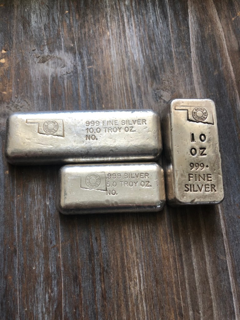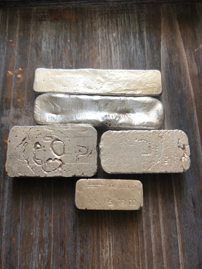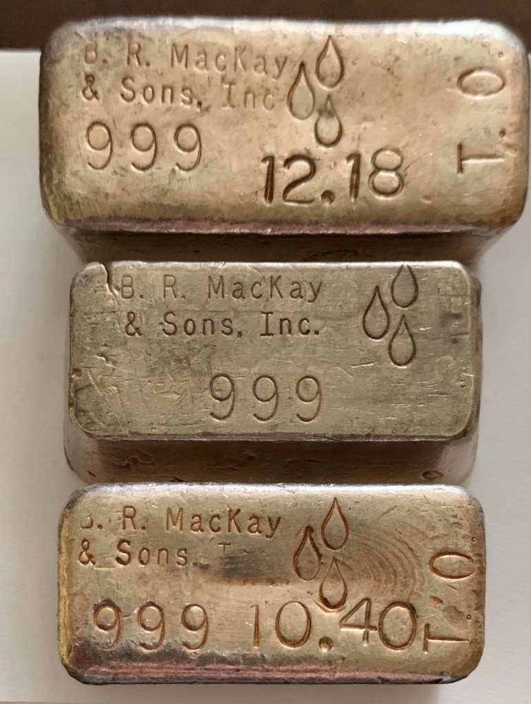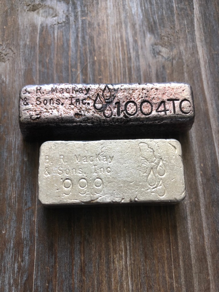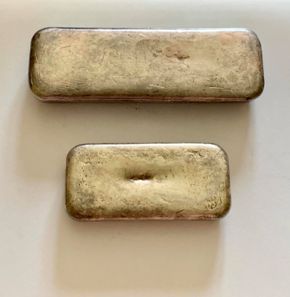 Bahamian Refining Company, interesting bread loaf style with serial/lot number stamped top center. Not much is known about them, other than they were an incorporated company in Arizona, operating in the early 1980s. I have a few interesting 1 oz pieces that I’ll post in a blog on “silver smalls.”