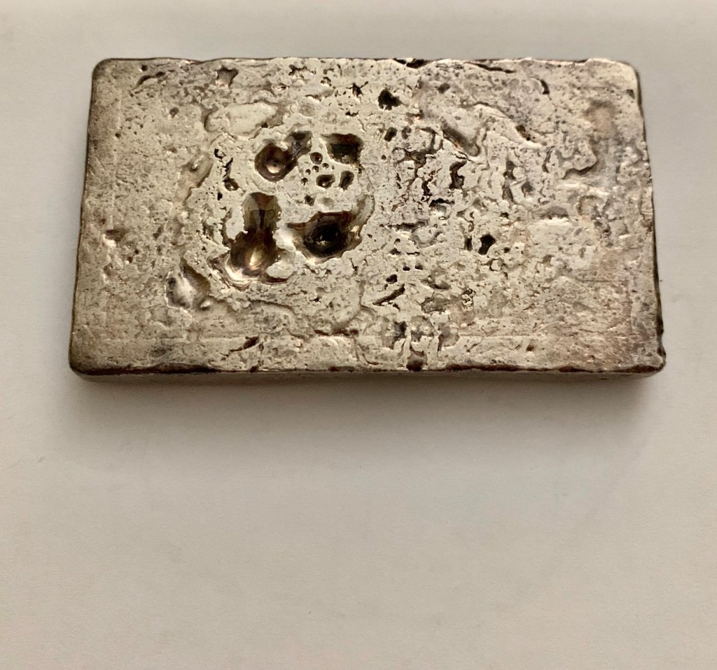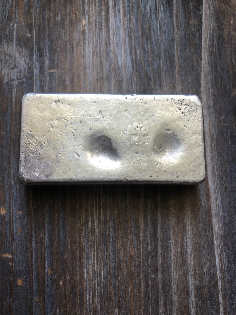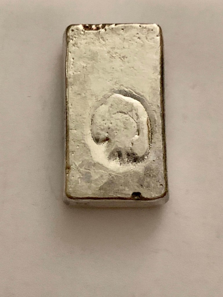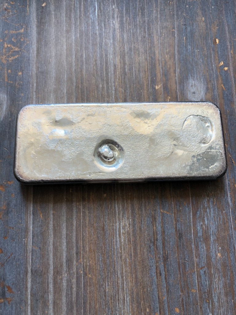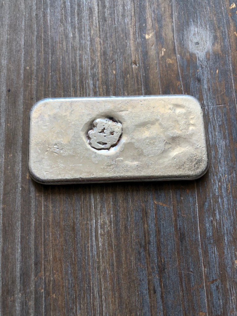 10 oz class with estimated mintage of <500. This pieces has nice patina. Not the weight stamp. It appears the corrected the first stamp appearing to be an “8” with a “7.” Absolutely love this bar.Reverse of 10 oz above.