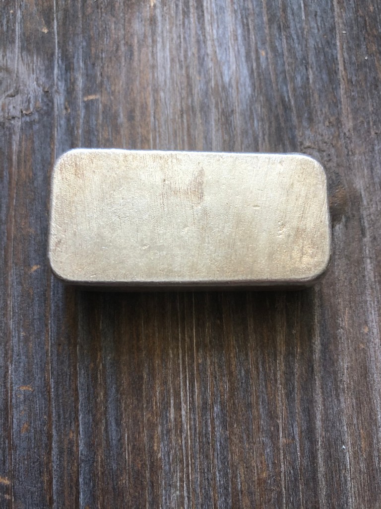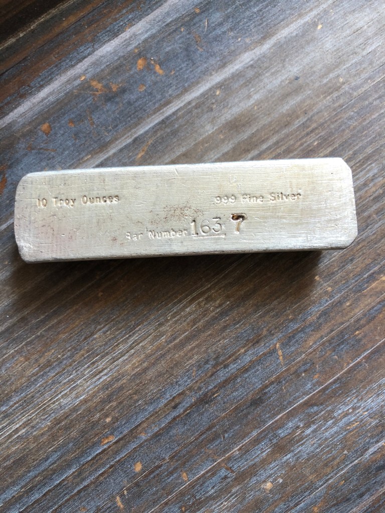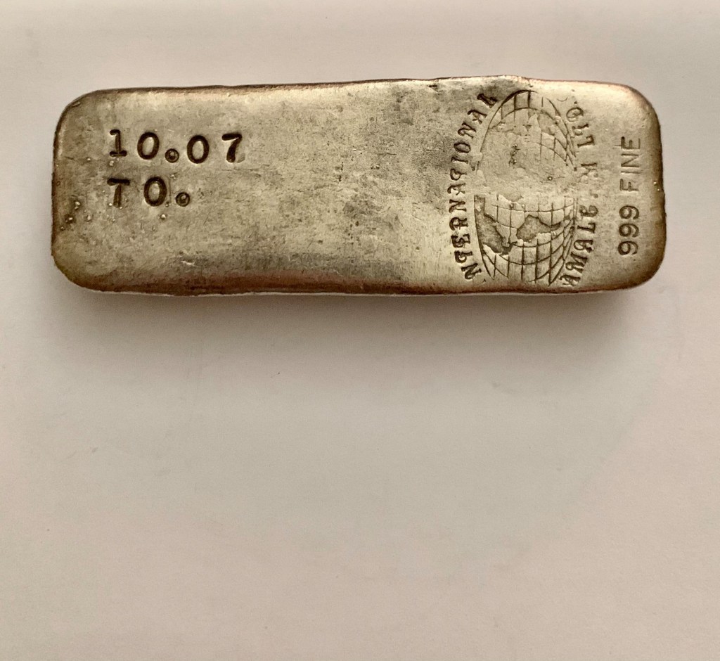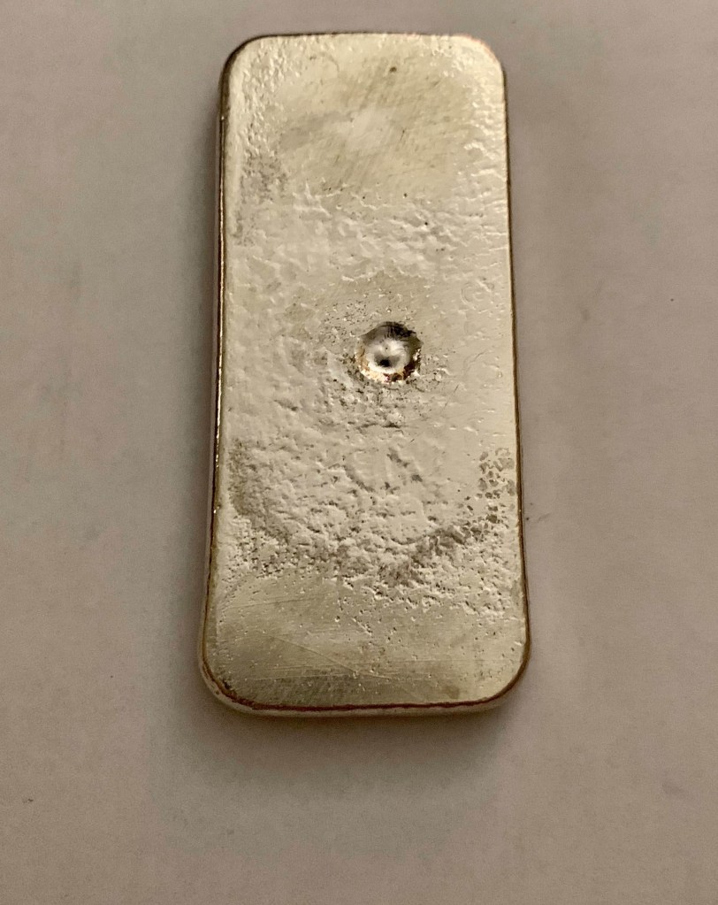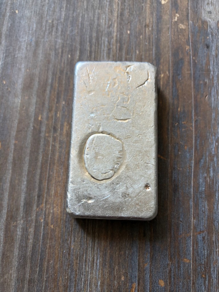 10 oz class with estimated mintage of <500. This pieces has nice patina. Not the weight stamp. It appears the corrected the first stamp appearing to be an “8” with a “7.” Absolutely love this bar.Reverse of 10 oz above.