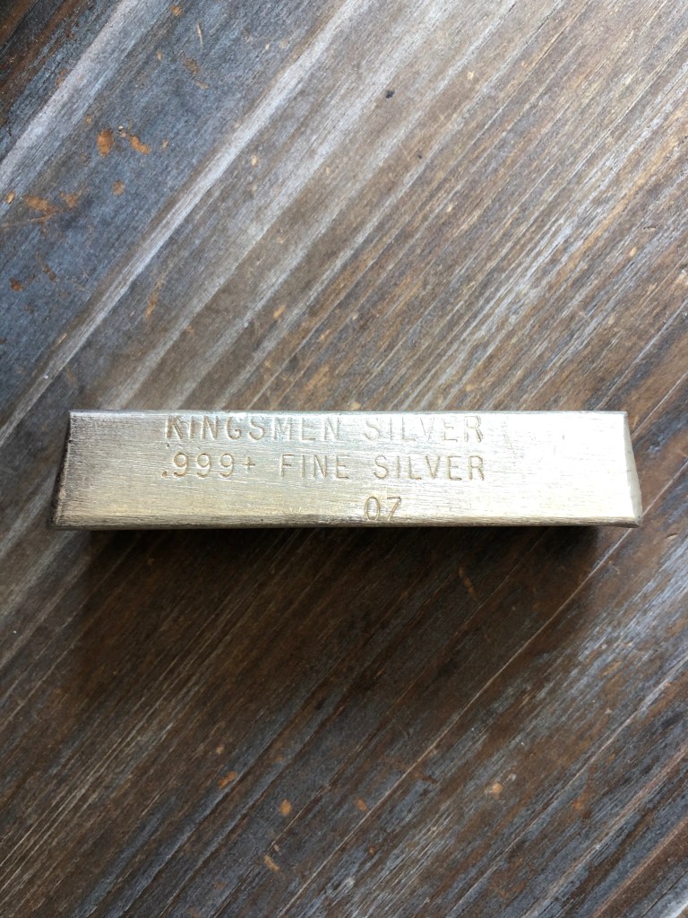 10 oz class Kingsmen, very rare counter-stamp.This Pure Silver was a commonly used mold, but very few Kingsman examples exist. I’ve seen one other.Bar #1637. Extruded example in same variety as Swiss of America an Rocky Mountain Mint (RMM).Reverse of extruded.