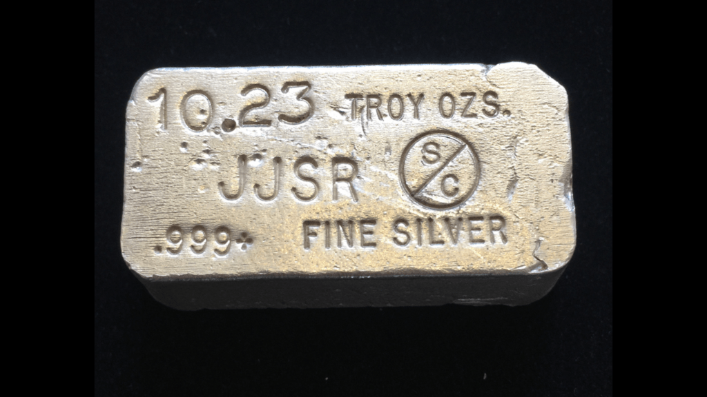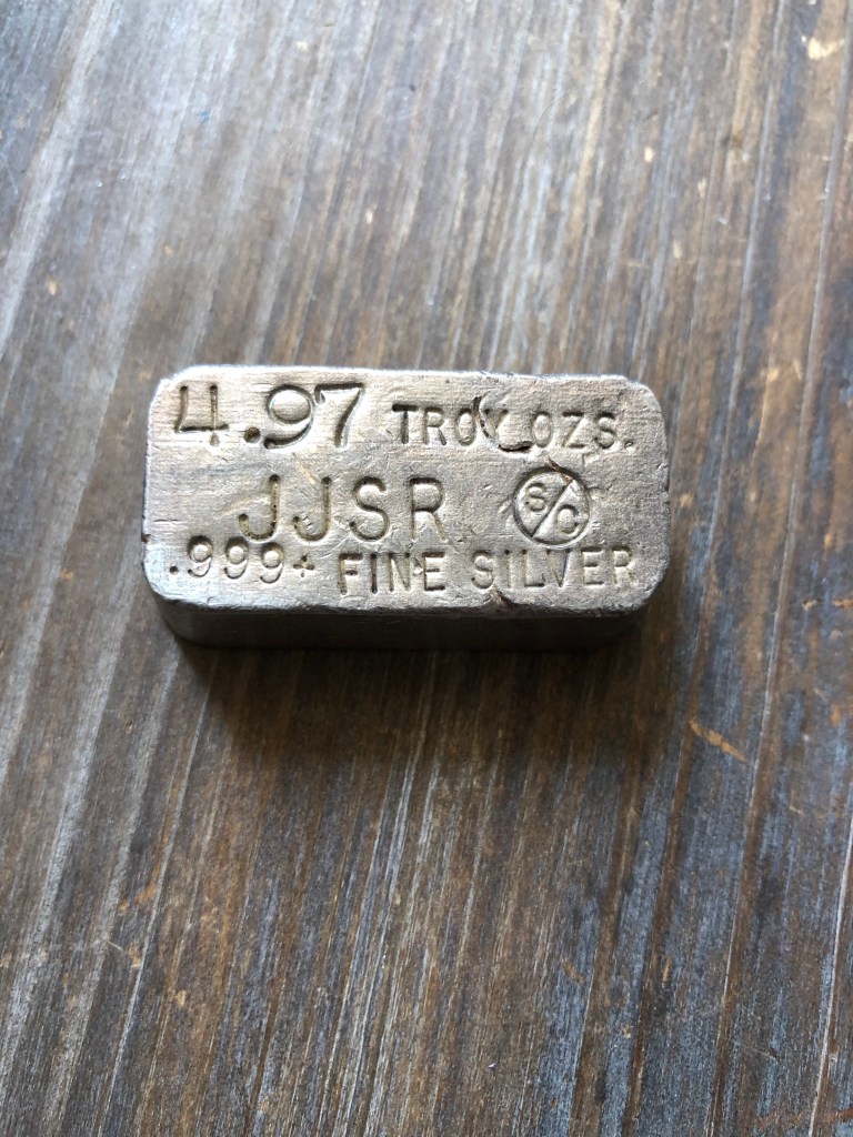 This was my first JJSR piece. Very nice bar. We still don’t know what the S/C inside of the circle mean. Very nice reverse. Clean example like it was poured yesterday.Beautiful 4 oz odd weight. This size is more scarce.Classic mold for 5 oz old pours.