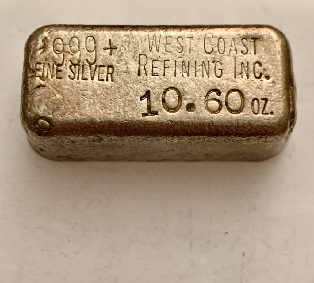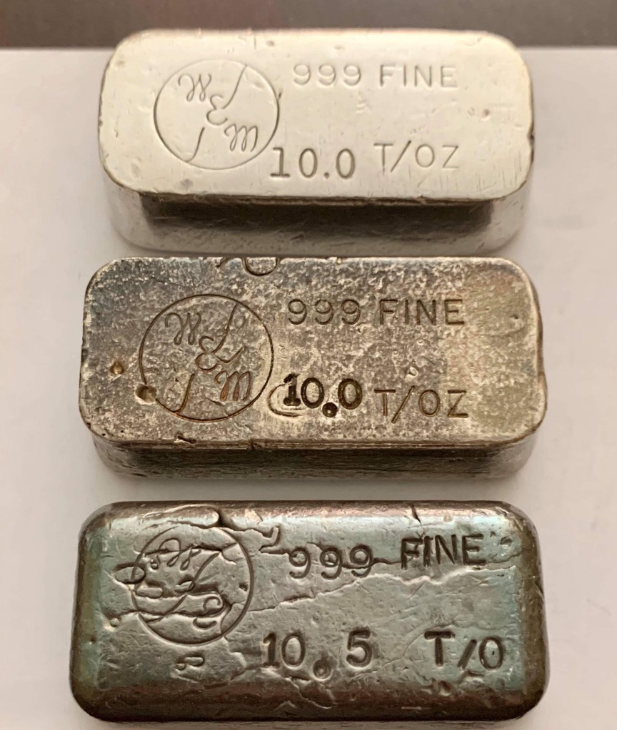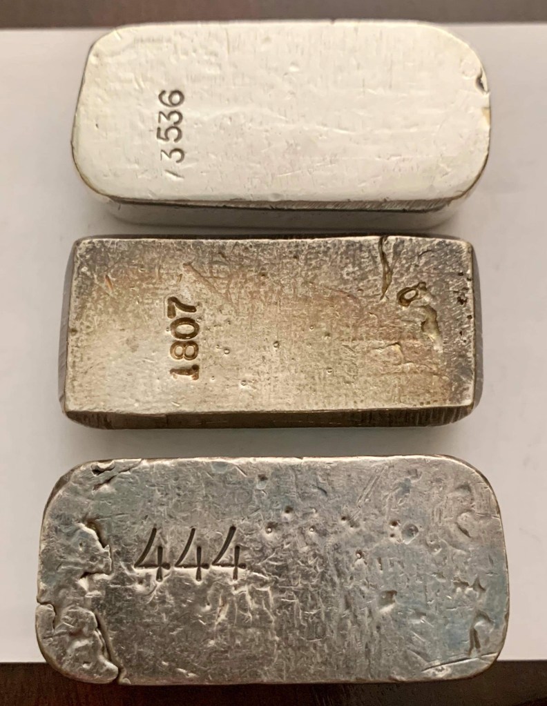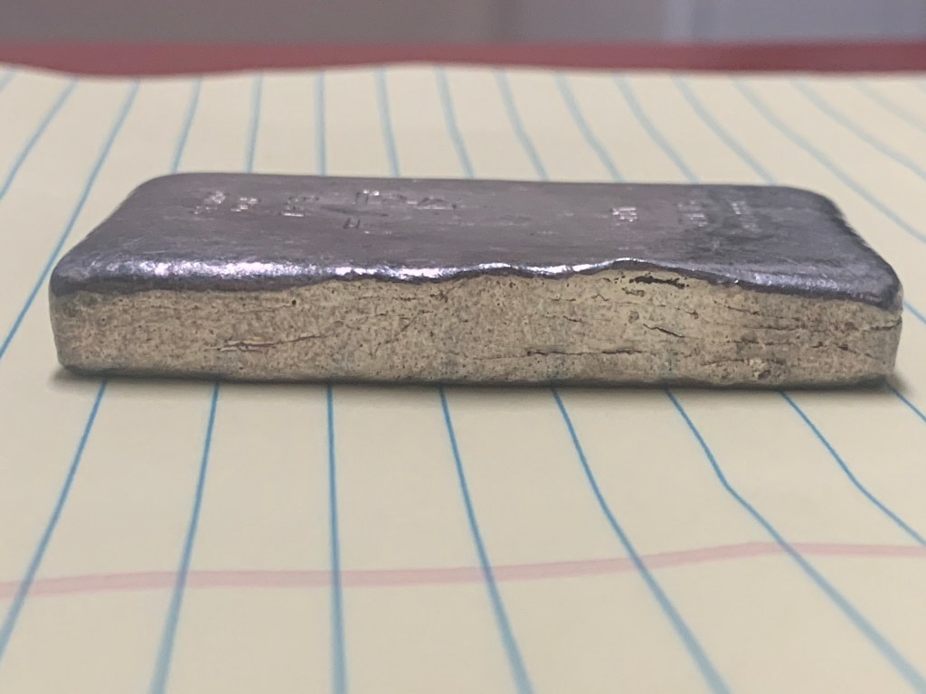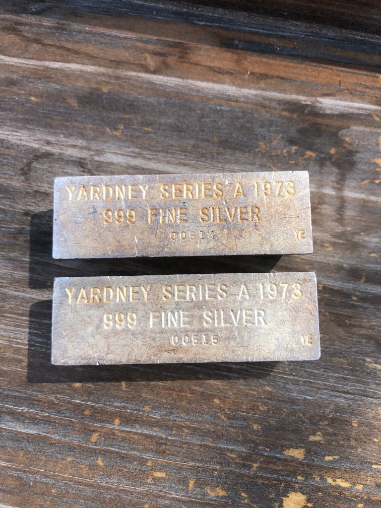 Yardney Electric Corporation was founded in 1944 in New York City. They were among the first companies in the world to successfully produce and commercialize rechargeable silver-zinc and magnesium silver chloride batteries. They were acquired in 1969 by Whittaker Corporation. In 1970, the company moved to Pawcatuck, Connecticut. They went through a series of changes over the years and today are known as Yardney Technical Products. Many of the ingots they did were presentation pieces and have initials of the recipient stamped on the ingot. I have two serializes pieces that are not personalized. I believe these to be much less common and very happy to have them. Each of these weigh 4 troy oz. This is common for all Yardney pieces.